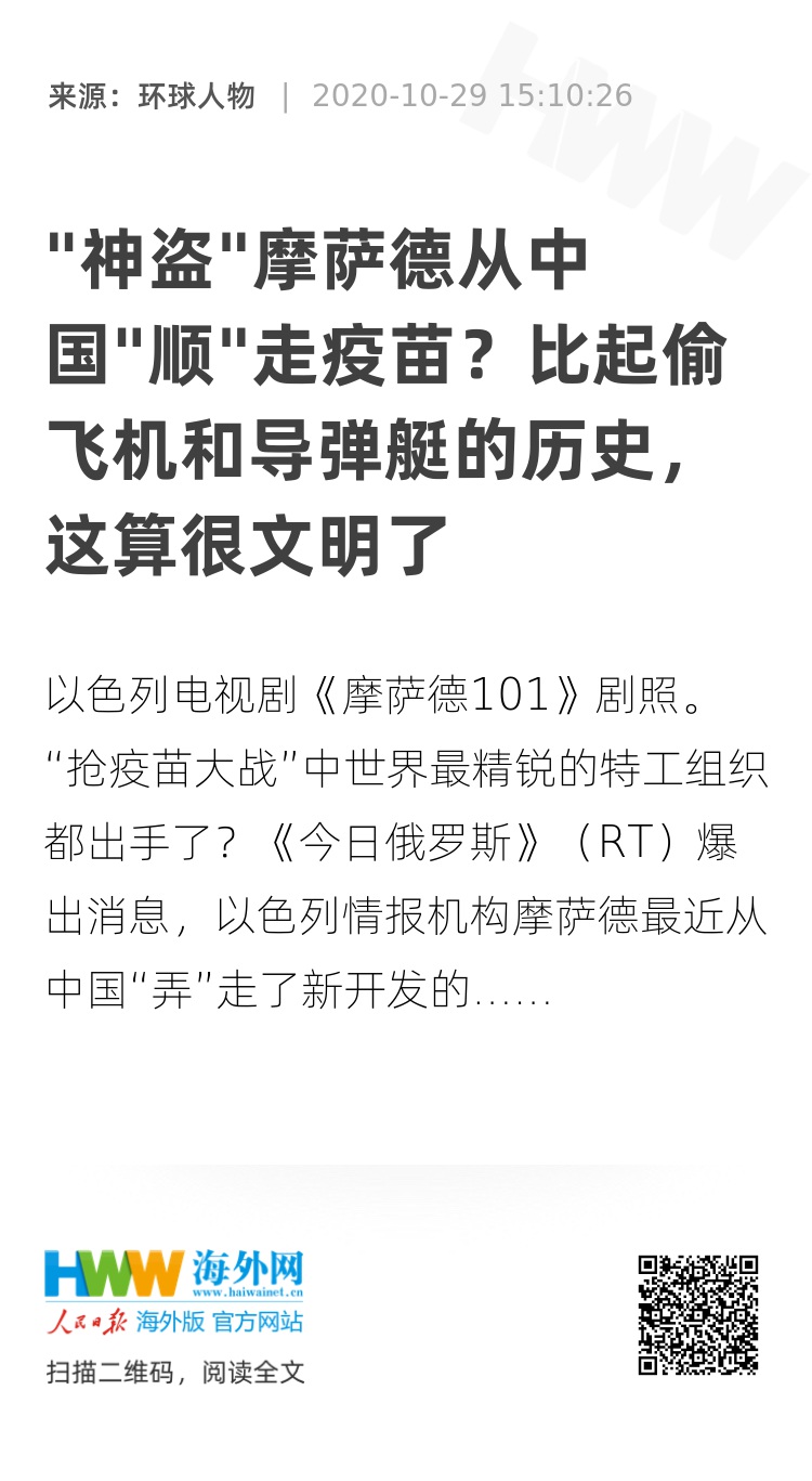 甭管事情真假,大家都相信,以摩萨德手眼通天的能力,从中国“弄”点疫苗是小意思。
