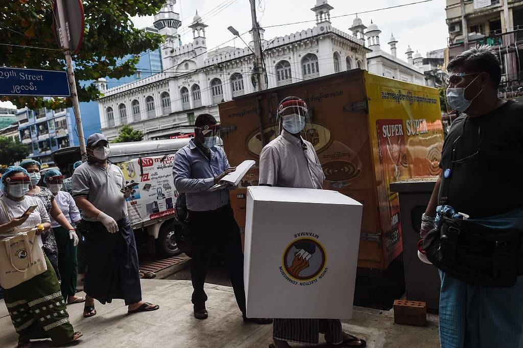 当地时间2020年10月29日,缅甸仰光,选举工作人员手持移动投票箱,帮助老年人进行提前投票。