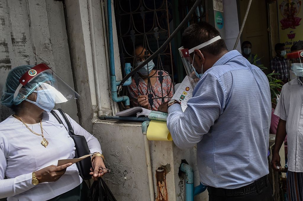 当地时间2020年10月29日,缅甸仰光,选举工作人员在投票站帮助老年人进行提前投票。