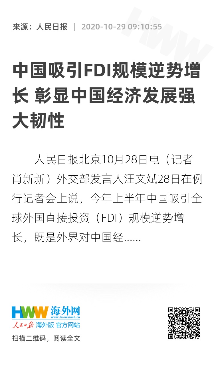 人民日报北京10月28日电(记者肖新新)外交部发言人汪文斌28日在例行记者会上说,今年上半年中国吸引全球外国直接投资(FDI)规模逆势增长,既是外界对中国经济发展投下的信任票,也是中国持续推进改革开放交出的成绩单,充分彰显了中国经济发展的强大韧性和中外互利合作的广阔前景。