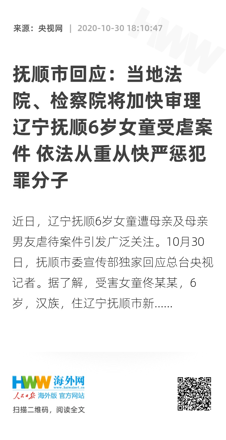 近日,辽宁抚顺6岁女童遭母亲及母亲男友虐待案件引发广泛关注。10月30日,抚顺市委宣传部独家回应总台央视记者。