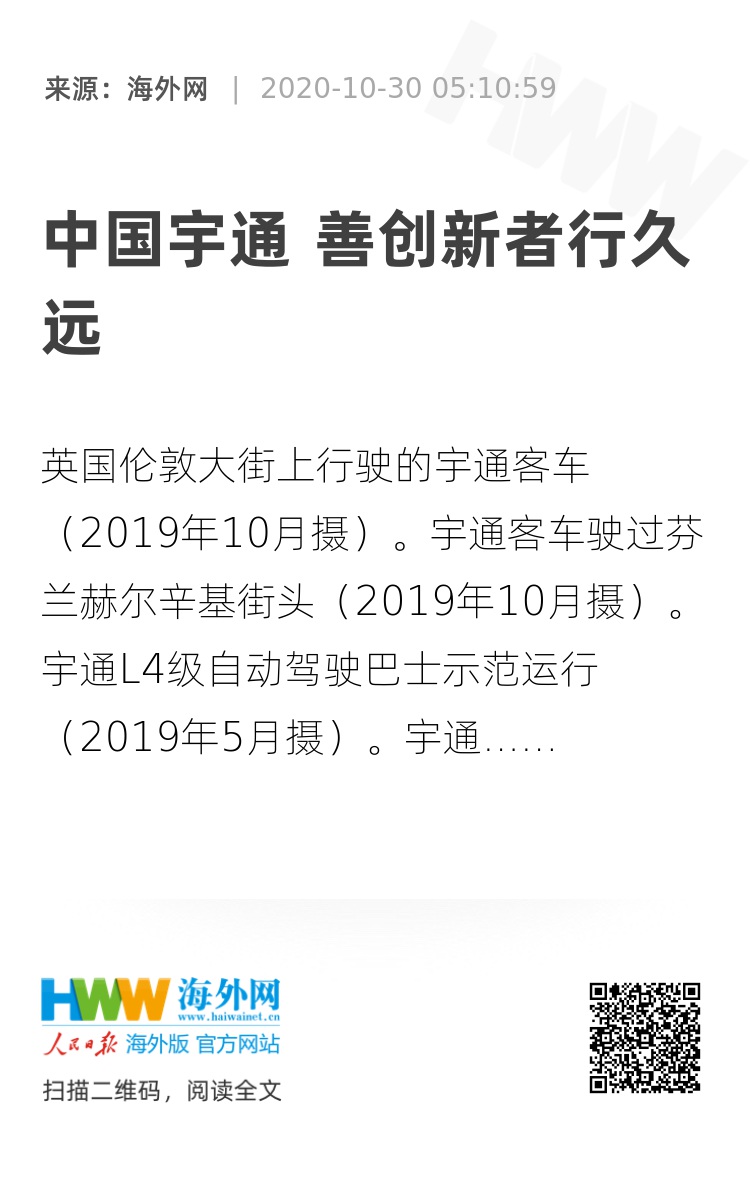 “与世界的每一次互动,与客户的每一次交流,对我们来说都是学习的过程。”在宇通海外市场总经理王文韬看来,服务全球美好出行的过程中,最大的收获就是发现了与世界共同前行、共同进步的机会。(本报记者 史志鹏)