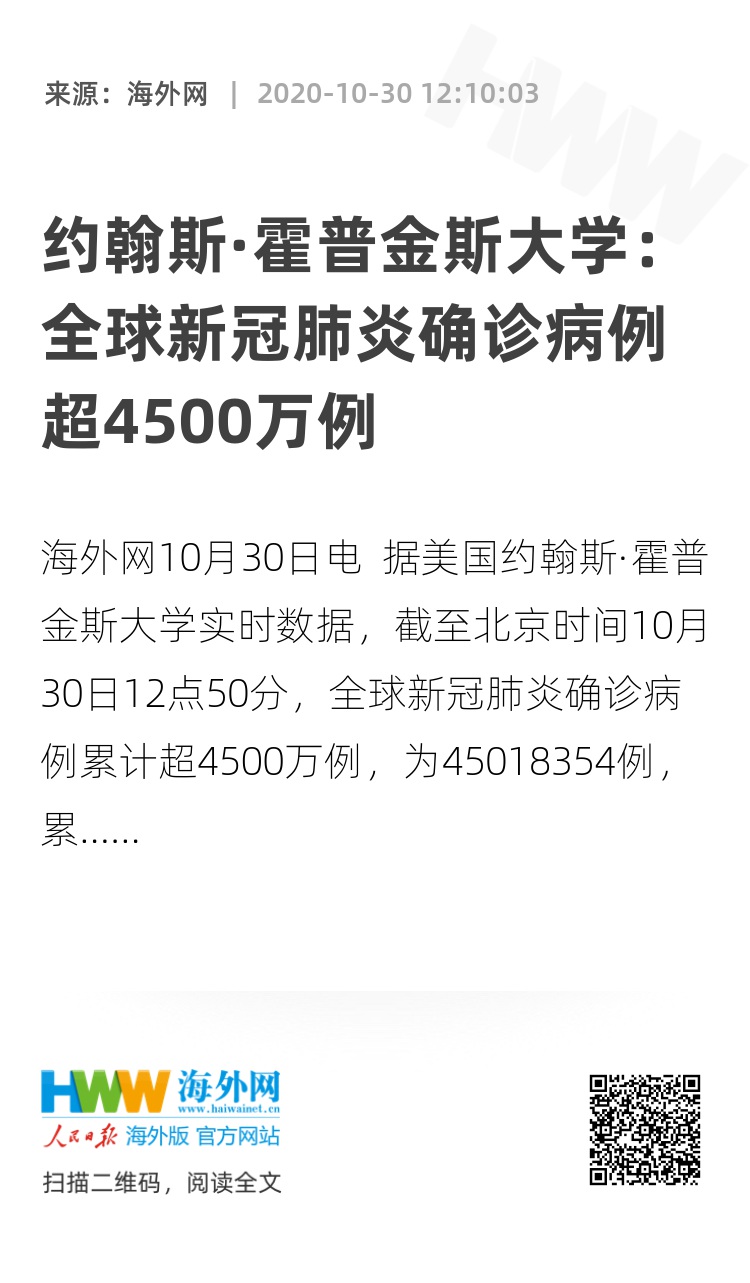 31906178,.约翰斯·霍普金斯大学:全球新冠肺炎确诊病例超4500万例,.2020-10-30 12:59:03,.204413,.王珊宁、李萌