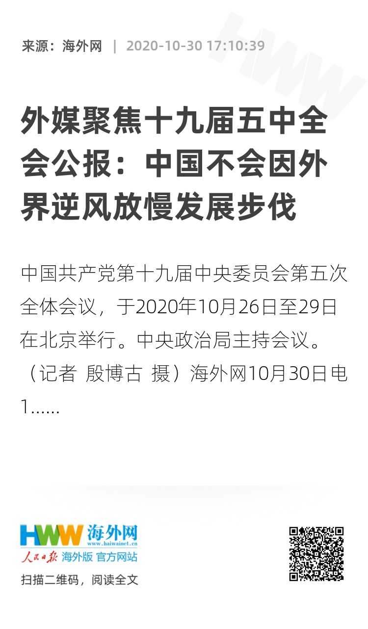公报中提到的“双循环”模式发展同样引发外媒热议,这项战略立足中国国内市场,谋求国内国际双循环相互促进。《联合早报》援引学者的话称,中国其实一直都在以“双循环”模式发展,此次全会也展现出中国不希望与外界脱钩,而是要继续对外开放,与世界联通。