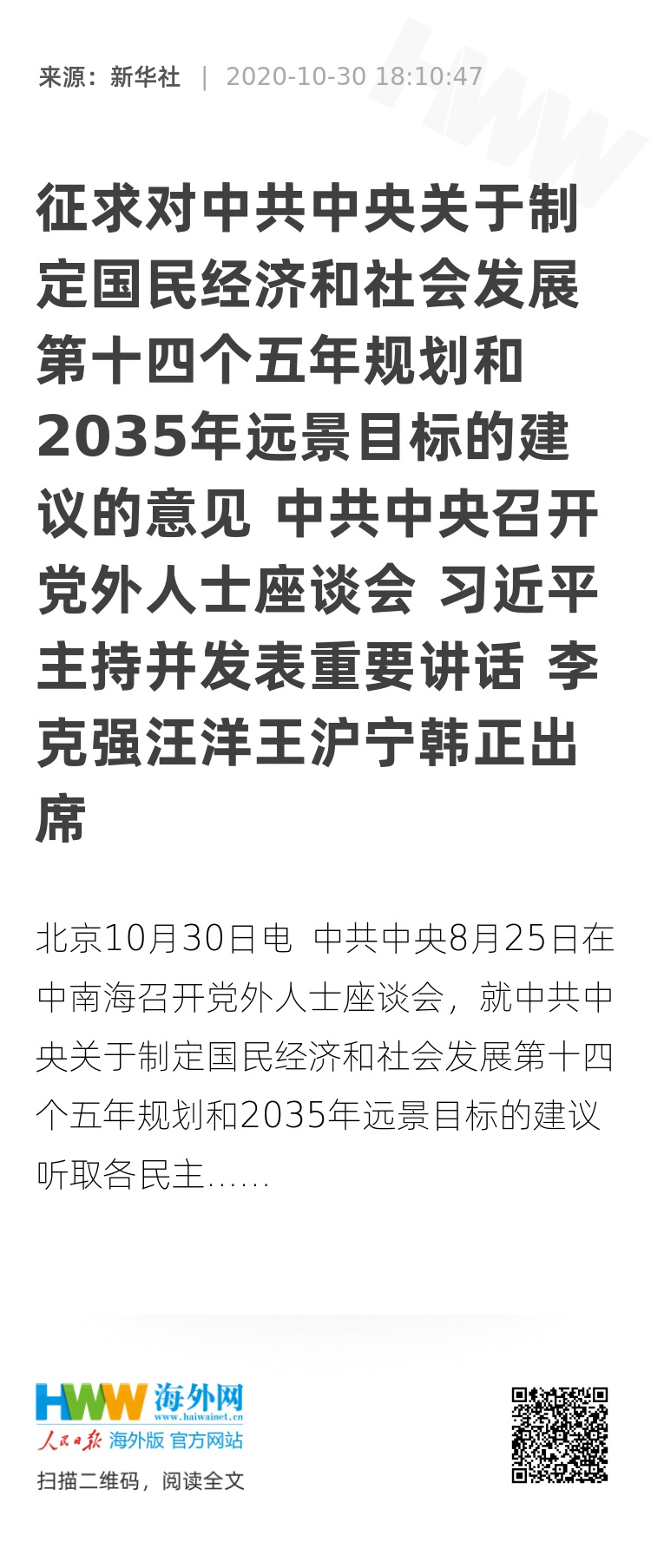 新华社北京10月30日电 中共中央8月25日在中南海召开党外人士座谈会,就中共中央关于制定国民经济和社会发展第十四个五年规划和2035年远景目标的建议听取各民主党派中央、全国工商联负责人和无党派人士代表的意见和建议。中共中央总书记习近平主持座谈会并发表重要讲话强调,“十四五”时期是我国全面建成小康社会、实现第一个百年奋斗目标之后,乘势而上开启全面建设社会主义现代化国家新征程、向第二个百年奋斗目标进军的第一个五年。摆在我们面前的历史性课题是加强顶层设计和科学规划,继续贯彻落实中共十九大作出的战略安排,制定好中长期发展规划建议,指导全党全国做好未来5年和更长时期经济社会发展工作。