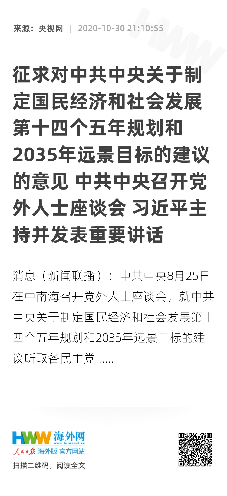 央视网消息(新闻联播):中共中央8月25日在中南海召开党外人士座谈会,就中共中央关于制定国民经济和社会发展第十四个五年规划和2035年远景目标的建议听取各民主党派中央、全国工商联负责人和无党派人士代表的意见和建议。中共中央总书记习近平主持座谈会并发表重要讲话强调,“十四五”时期是我国全面建成小康社会、实现第一个百年奋斗目标之后,乘势而上开启全面建设社会主义现代化国家新征程、向第二个百年奋斗目标进军的第一个五年。摆在我们面前的历史性课题是加强顶层设计和科学规划,继续贯彻落实中共十九大作出的战略安排,制定好中长期发展规划建议,指导全党全国做好未来5年和更长时期经济社会发展工作。