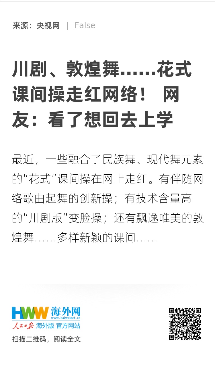 最近,一些融合了民族舞、现代舞元素的“花式”课间操在网上走红。有伴随网络歌曲起舞的创新操;有技术含量高的“川剧版”变脸操;还有飘逸唯美的敦煌舞……多样新颖的课间操形式让学生们的课间生活更加丰富多彩了。