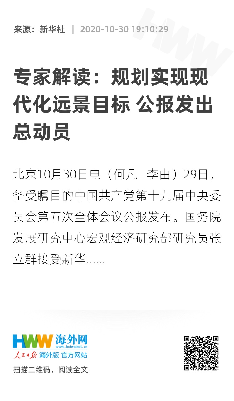 新华网北京10月30日电(何凡 李由)29日,备受瞩目的中国共产党第十九届中央委员会第五次全体会议公报发布。国务院发展研究中心宏观经济研究部研究员张立群接受新华网连线采访时表示,当今世界正经历百年未有之大变局,五中全会公报既对我国“十三五”时期发展迈出关键性步伐进行重要回顾和总结,又对“十四五”发展及二〇三五年基本实现社会主义现代化远景目标展开高屋建瓴的谋划,发出了应对挑战、振奋人心的总动员。