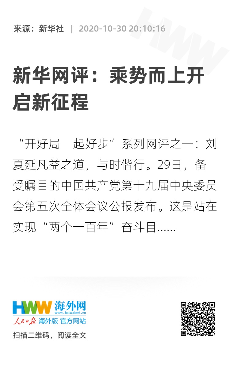 凡益之道,与时偕行。29日,备受瞩目的中国共产党第十九届中央委员会第五次全体会议公报发布。这是站在实现“两个一百年”奋斗目标的历史交汇点上谋划的宏伟蓝图,预示着一个蕴藏着无限生机与活力的中国,即将昂首阔步踏上全面建设社会主义现代化国家的壮丽新征程。