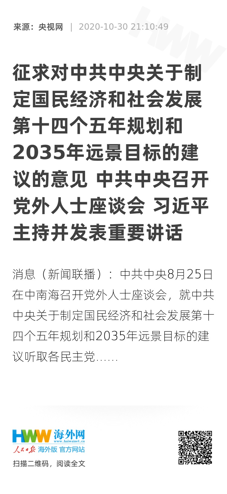 央视网消息(新闻联播):中共中央8月25日在中南海召开党外人士座谈会,就中共中央关于制定国民经济和社会发展第十四个五年规划和2035年远景目标的建议听取各民主党派中央、全国工商联负责人和无党派人士代表的意见和建议。中共中央总书记习近平主持座谈会并发表重要讲话强调,“十四五”时期是我国全面建成小康社会、实现第一个百年奋斗目标之后,乘势而上开启全面建设社会主义现代化国家新征程、向第二个百年奋斗目标进军的第一个五年。摆在我们面前的历史性课题是加强顶层设计和科学规划,继续贯彻落实中共十九大作出的战略安排,制定好中长期发展规划建议,指导全党全国做好未来5年和更长时期经济社会发展工作。