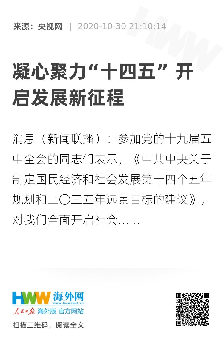 央视网消息(新闻联播):参加党的十九届五中全会的同志们表示,《中共中央关于制定国民经济和社会发展第十四个五年规划和二〇三五年远景目标的建议》,对我们全面开启社会主义现代化建设新征程具有重要意义。全党全国各族人民要紧密团结在以习近平同志为核心的党中央周围,再接再厉、一鼓作气,确保如期打赢脱贫攻坚战,确保如期全面建成小康社会,实现第一个百年奋斗目标,夺取全面建设社会主义现代化国家新胜利。