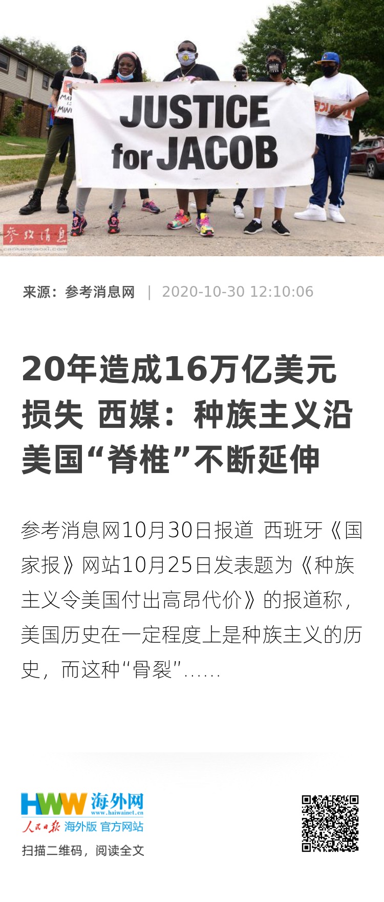 参考消息网10月30日报道 西班牙《国家报》网站10月25日发表题为《种族主义令美国付出高昂代价》的报道称,美国历史在一定程度上是种族主义的历史,而这种“骨裂”仍在沿着美国的脊椎向下延伸。根据花旗集团一份长达104页的报告,本世纪截至目前,种族主义已经给美国经济造成了16万亿美元的损失。全文摘编如下: