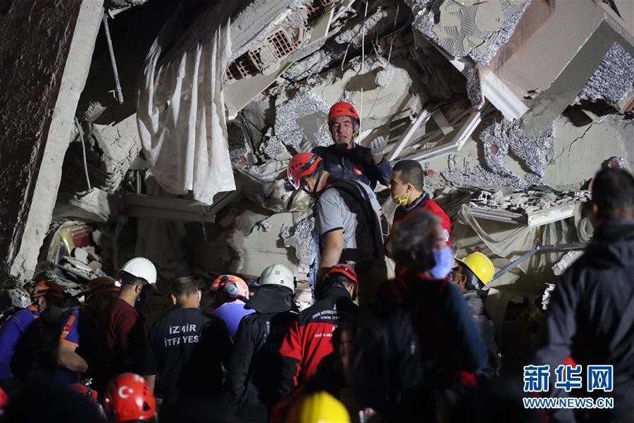 10月30日,在土耳其伊兹密尔省, 救援人员展开搜救工作。 土耳其西部爱琴海海域30日发生6.6级地震,已造成土耳其至少12人死亡,数百人受伤。 新华社发(艾登·切廷卡亚摄)