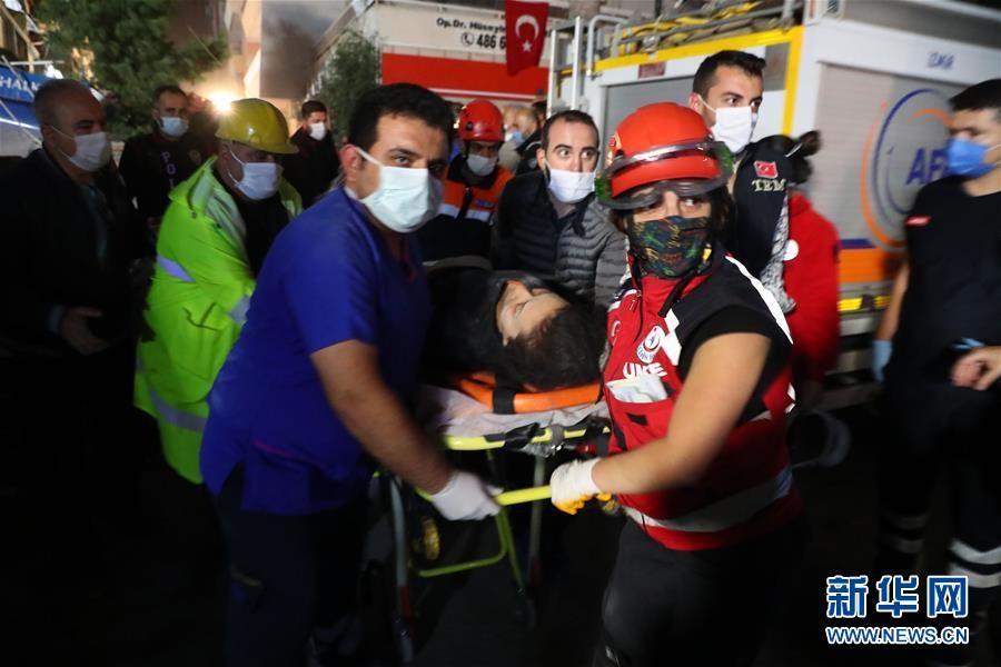 10月30日,在土耳其伊兹密尔省, 救援人员运送一名伤者。 土耳其西部爱琴海海域30日发生6.6级地震,已造成土耳其至少12人死亡,数百人受伤。 新华社发(艾登·切廷卡亚摄)