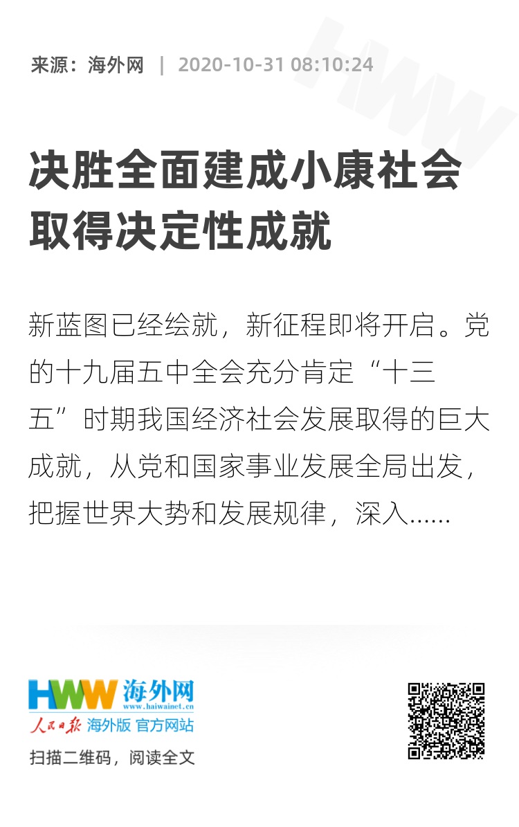到建党100周年时,全面建成惠及十几亿人口的更高水平的小康社会,是我们党进入新世纪后,在基本建成小康社会基础上提出的奋斗目标,是对人民的庄严承诺。自改革开放之初党中央提出小康社会的战略构想以来,我们党把人民对美好生活的向往作为奋斗目标,几代人一以贯之、接续奋斗。现在,“十三五”规划目标任务即将完成,全面建成小康社会胜利在望,中华民族伟大复兴向前迈出了新的一大步,社会主义中国以更加雄伟的身姿屹立于世界东方。全会强调,全党全国各族人民要再接再厉、一鼓作气,确保如期打赢脱贫攻坚战,确保如期全面建成小康社会、实现第一个百年奋斗目标,为开启全面建设社会主义现代化国家新征程奠定坚实基础。