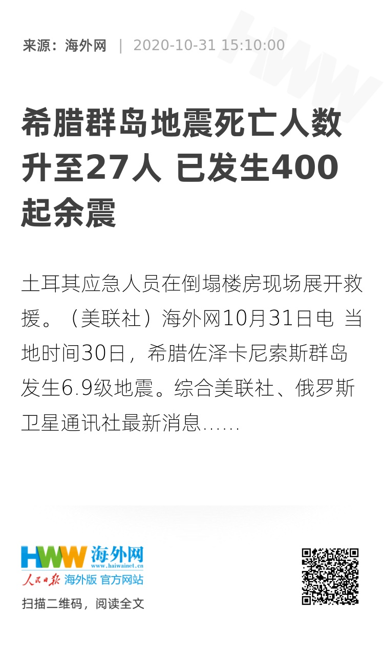 海外网10月31日电 当地时间30日,希腊佐泽卡尼索斯群岛发生6.9级地震。综合美联社、俄罗斯卫星通讯社最新消息,死亡人数已上升到27人,震后又发生了至少400起余震。