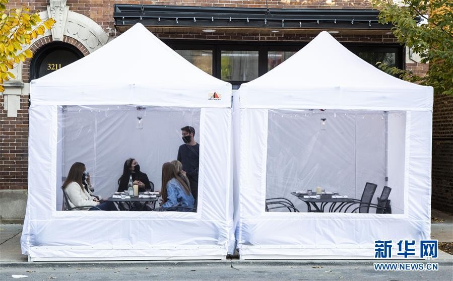 10月30日,在美国伊利诺伊州芝加哥,顾客在餐馆室外帐篷中点餐。 当日,伊利诺伊州新增新冠确诊病例6943例。从当日起,伊利诺伊州再次禁止芝加哥的餐馆、酒吧等提供室内餐饮服务,室外餐饮必须在晚11时停止。 新华社发(乔尔·莱纳摄)