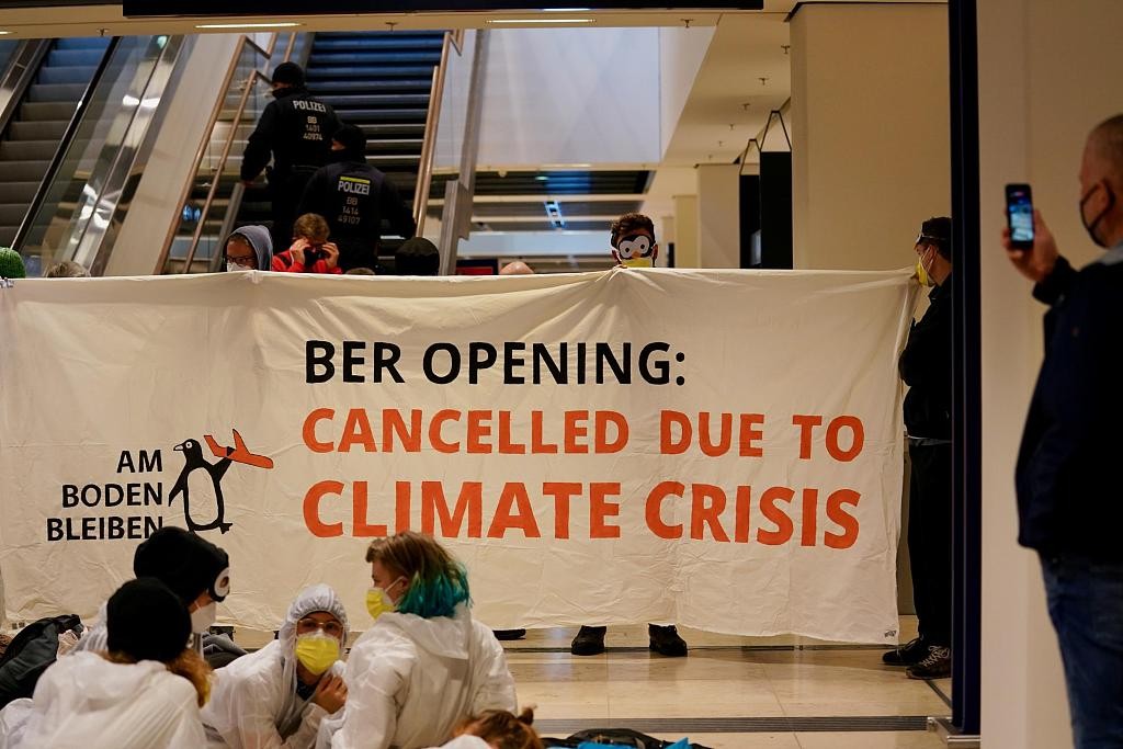 当地时间2020年10月31日,延后启用达九年的德国柏林新机场正式投入使用。启用当天,环保主义者在机场航站楼内抗议。 图片来源:视觉中国