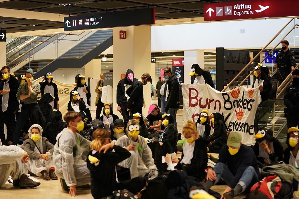 当地时间2020年10月31日,延后启用达九年的德国柏林新机场正式投入使用。启用当天,环保主义者在机场航站楼内抗议。 图片来源:视觉中国