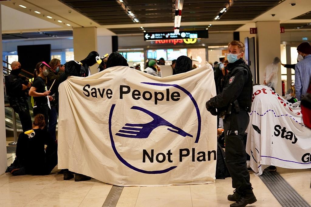 当地时间2020年10月31日,延后启用达九年的德国柏林新机场正式投入使用。启用当天,环保主义者在机场航站楼内抗议。 图片来源:视觉中国