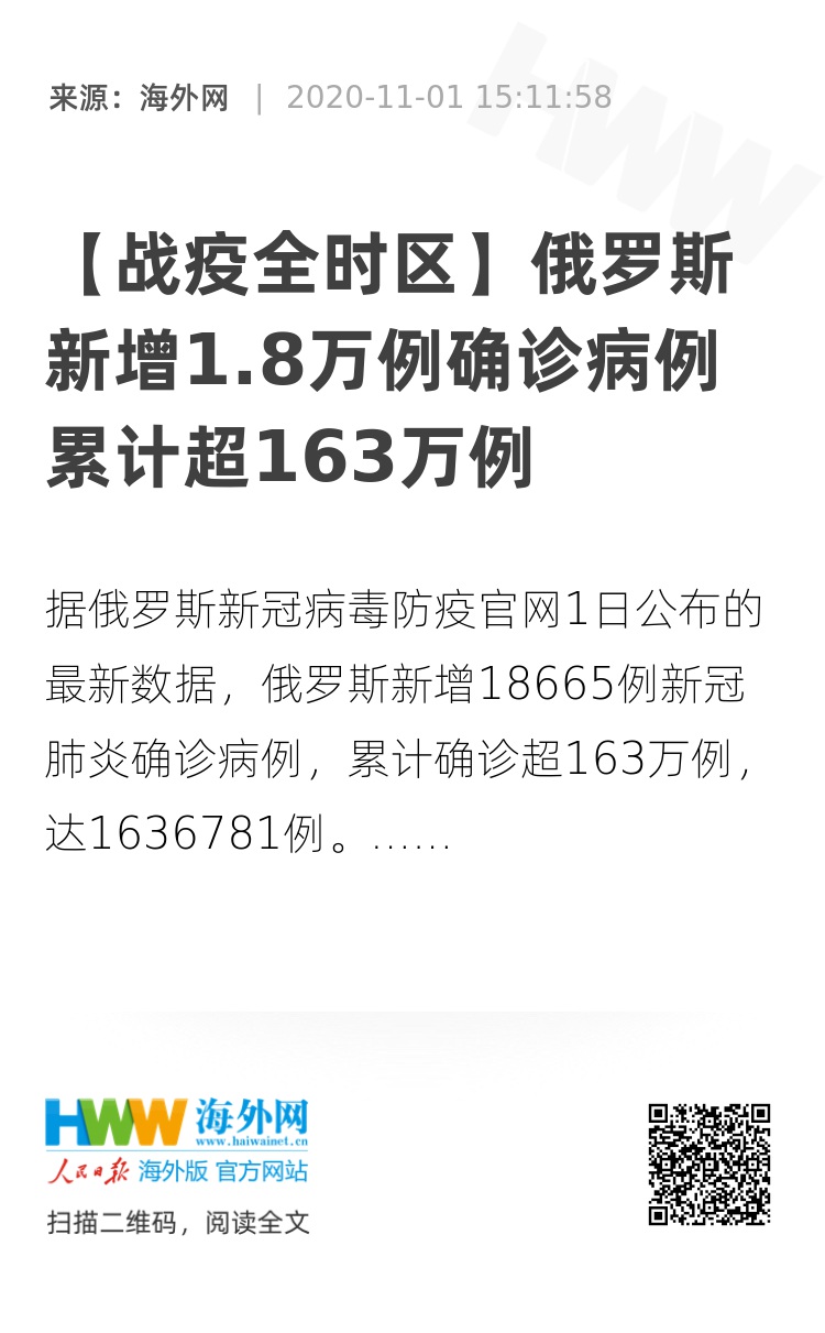海外网11月1日电 据俄罗斯新冠病毒防疫官网1日公布的最新数据,俄罗斯新增18665例新冠肺炎确诊病例,累计确诊超163万例,达1636781例,新增新冠肺炎死亡病例245例,累计死亡28235例。(海外网 朱惠悦)