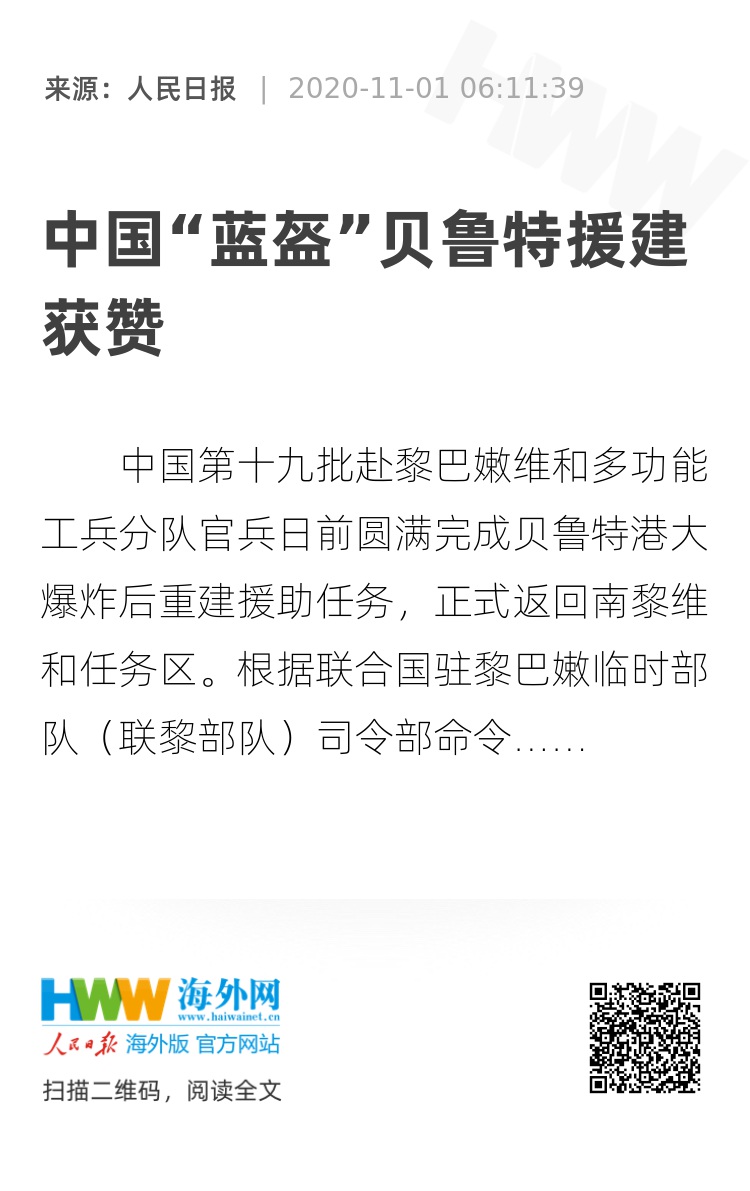 爆炸的冲击波导致贝鲁特市区古拉玛街道上一栋超过百年的建筑倒塌,废墟掩埋了多处文物古迹和多件贵重物品,道路也被阻断。街道现场空间狭小,机械难以施展,为防止文物受到二次破坏,大部分搜寻清理工作需要徒手完成。分析现场后,中方提出机械与人工相结合的作业方案。经过多方合作,从进入作业区到任务结束,仅用了4天时间。道路抢通那一刻,当地居民自发站在道路两侧热烈鼓掌。该街道一家店铺的店主哈劳特说:“感谢中国维和官兵为贝鲁特重建作出的努力,在他们的帮助下我们的正常生活和经营得以恢复。”