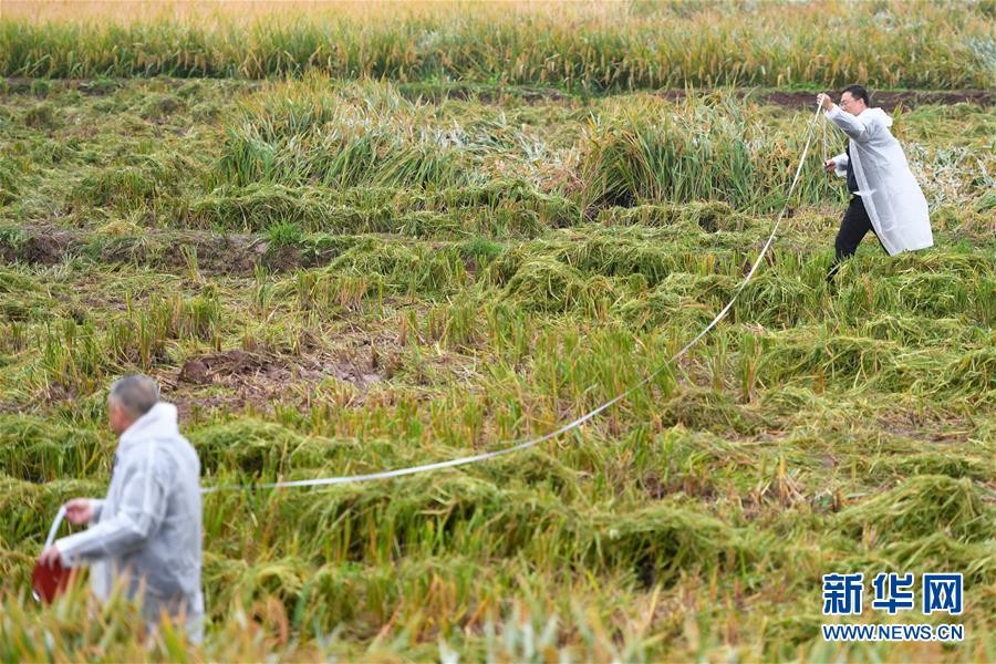 11月2日,在第三代杂交水稻“叁优一号”衡南试验示范基地一块被抽取测产的示范田里,工作人员在测量示范田面积。  新华社记者 陈泽国 摄