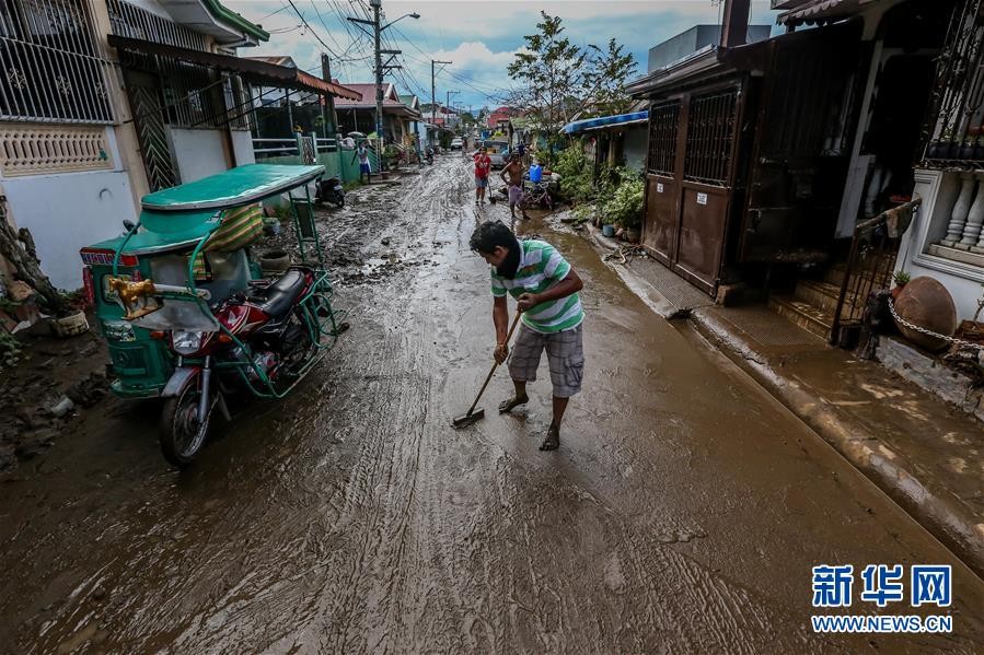 11月2日,一名男子在菲律宾八打雁省清扫洪水过后的路面。台风“天鹅”带来的强降雨引发洪水。 台风“天鹅”11月1日在菲律宾吕宋岛东南沿海登陆,目前已造成该国至少16人死亡。 新华社发(乌马利摄)