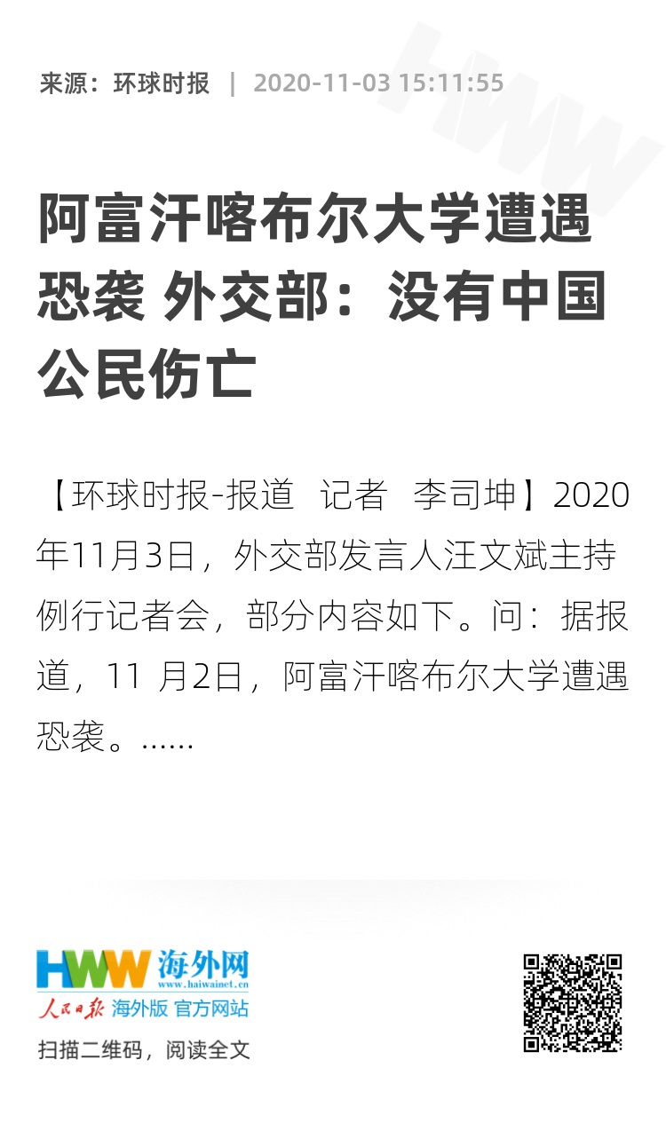 问:据报道,11 月2日,阿富汗喀布尔大学遭遇恐袭。3名武装分子在校园持枪扫射并制造爆炸,造成至少19人死亡、22人受伤。“伊斯兰国”宣称对袭击负责。请问中方对此有何评论?是否有中国公民在上述袭击事件中伤亡?