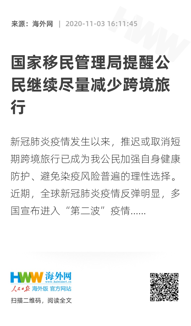 新冠肺炎疫情发生以来,推迟或取消短期跨境旅行已成为我公民加强自身健康防护、避免染疫风险普遍的理性选择。近期,全球新冠肺炎疫情反弹明显,多国宣布进入“第二波”疫情并强化出入境管制和防疫管理措施。国家移民管理局再次提醒,为有效降低染疫风险,公民应尽量减少不必要非急需跨境旅行,取消或推迟出国旅游行程安排。出行人员可通过查询“出入境信息一键通”等方式提前了解目的国对人员入境管理和防疫管理的措施,防止因无法入境和集中隔离带来不必要损失,减少旅行染疫风险,确保自身和他人安全。
