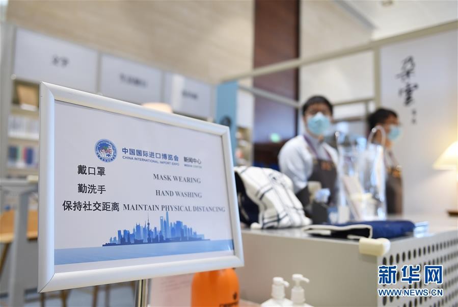 新闻中心内防疫提示随处可见(11月3日摄)。 第三届中国国际进口博览会新闻中心已正式开始运营。 新华社记者 赵丁喆 摄