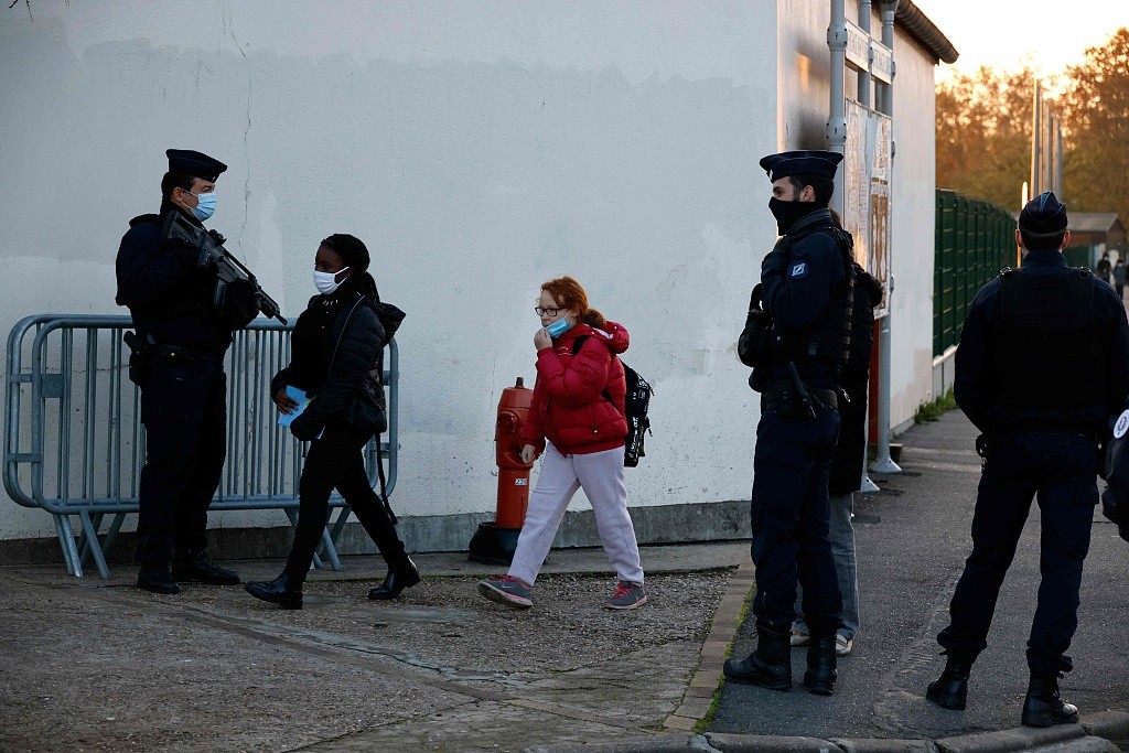 当地时间2020年11月3日,法国法兰西岛大区伊夫林省,当地宪兵部队在一所中学巡逻确保学生安全重返校园。图片来源:人民视觉/视觉中国