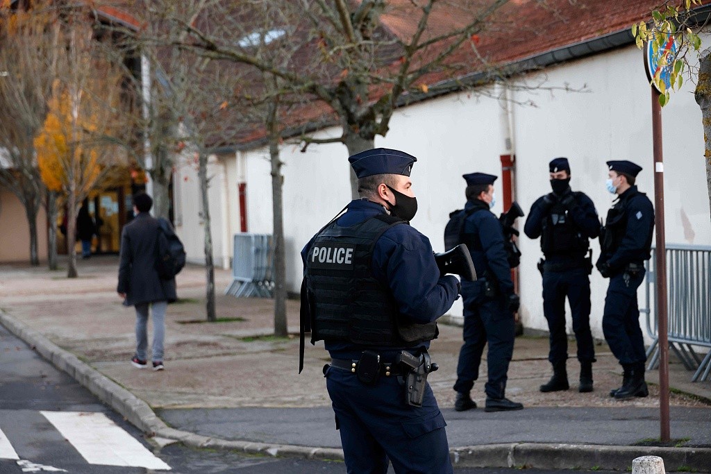当地时间2020年11月3日,法国法兰西岛大区伊夫林省,当地宪兵部队在一所中学巡逻确保学生安全重返校园。图片来源:人民视觉/视觉中国
