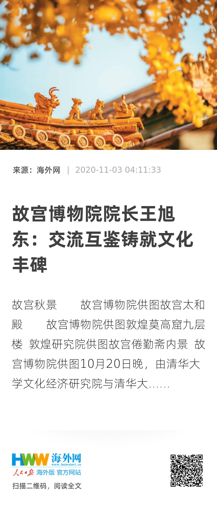 10月20日晚,由清华大学文化经济研究院与清华大学国家大学生文化素质教育基地联合主办的清华大学文化艺术大讲堂拉开帷幕。作为首期主讲人,故宫博物院院长王旭东以“敦煌与故宫——不同力量铸就的文化丰碑”为主题,为现场的师生讲述了敦煌与故宫的历史文化内涵,同时分享了自己在这两大文化殿堂工作的感悟。本报记者特邀请王旭东院长,就读者感兴趣的相关问题,回答记者提问。