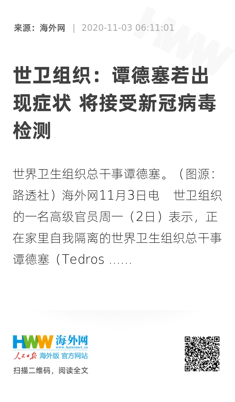 海外网11月3日电 世卫组织的一名高级官员周一(2日)表示,正在家里自我隔离的世界卫生组织总干事谭德塞(Tedros Adhanom Ghebreyesus)如果出现症状,将接受新冠病毒检测。