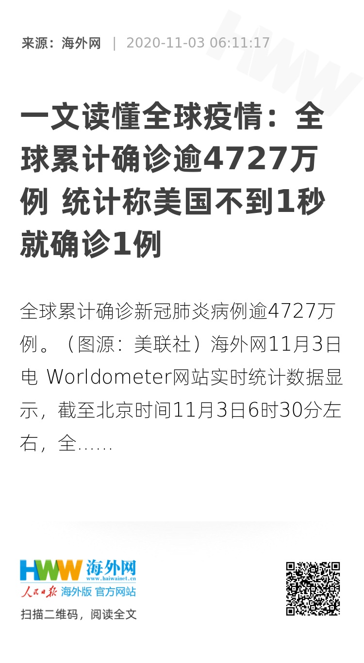 海外网11月3日电 Worldometer网站实时统计数据显示,截至北京时间11月3日6时30分左右,全球累计确诊新冠肺炎病例47272539例,累计死亡病例1210225例,112个国家和地区确诊病例超过万例。