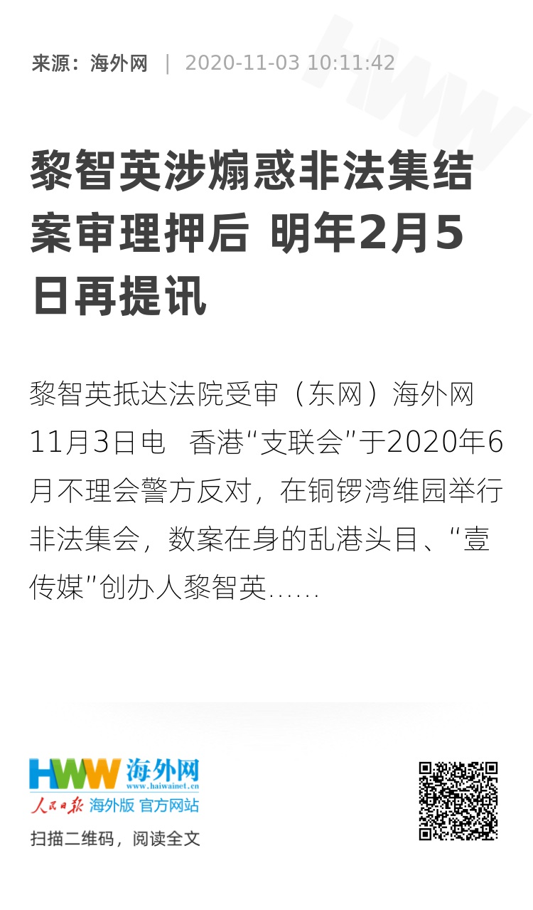海外网11月3日电 香港“支联会”于2020年6月不理会警方反对,在铜锣湾维园举行非法集会,数案在身的乱港头目、“壹传媒”创办人黎智英参与了集会。警方经调查后向黎智英、李卓人等人发出传票,分别控告他们煽惑他人参与未经批准集结等罪,案件于今早(3日)在区域法院提讯。控方在法庭上表示,由于部分被告正等候法律援助及法律指示,与辩方商讨后,决定申请将全部案件押后至明年(2021年)2月5日再讯,届时控方将申请把所有案件合并处理,有关申请获法官批准。