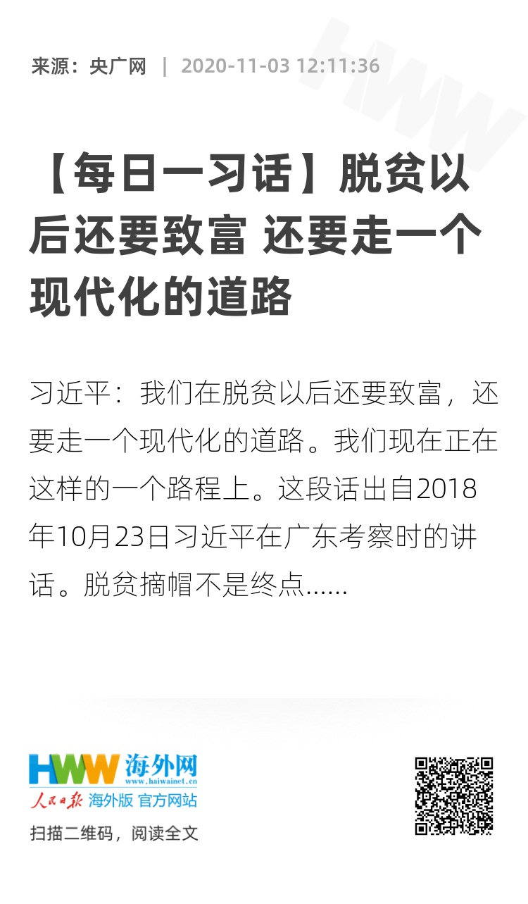 习近平:我们在脱贫以后还要致富,还要走一个现代化的道路。我们现在正在这样的一个路程上。