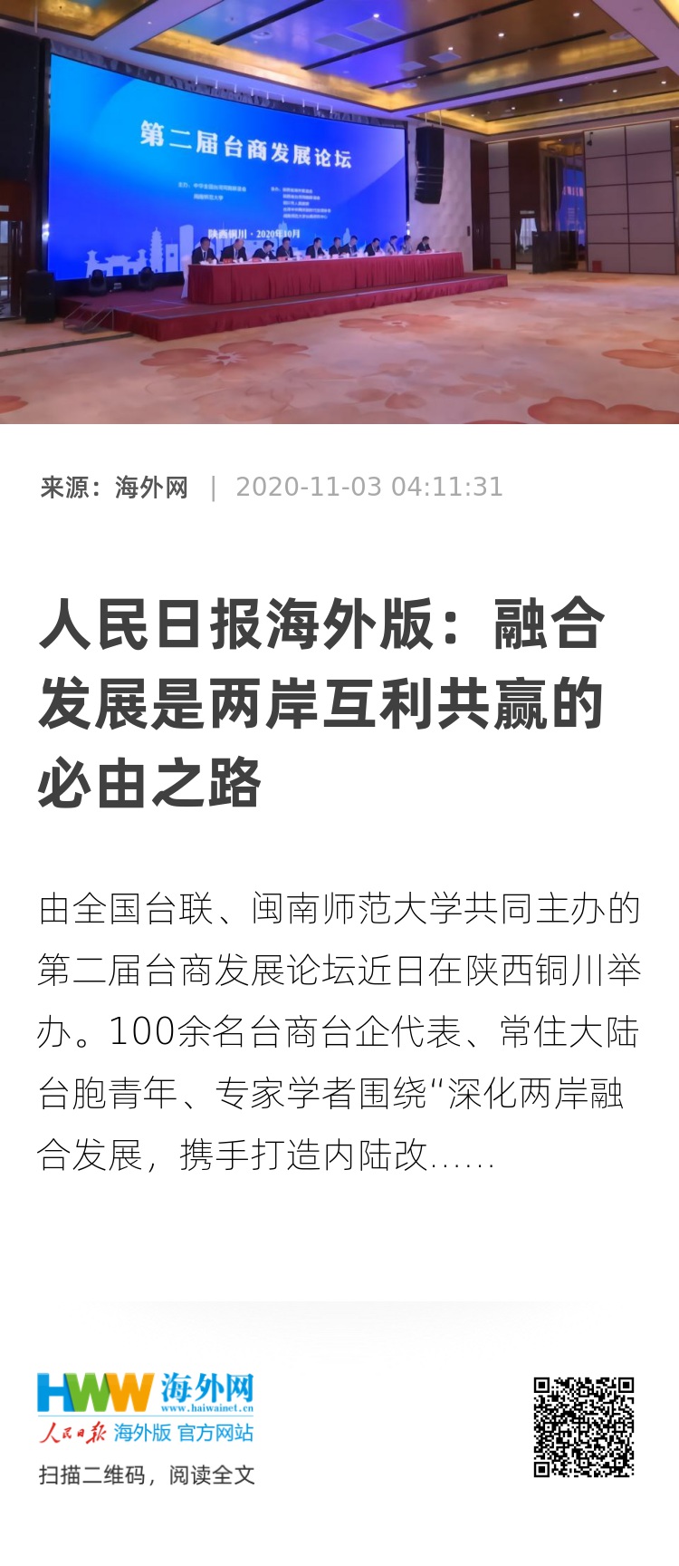 由全国台联、闽南师范大学共同主办的第二届台商发展论坛近日在陕西铜川举办。100余名台商台企代表、常住大陆台胞青年、专家学者围绕“深化两岸融合发展,携手打造内陆改革开放新高地”主题,共商融合发展大计,共谋合作共赢新篇。
