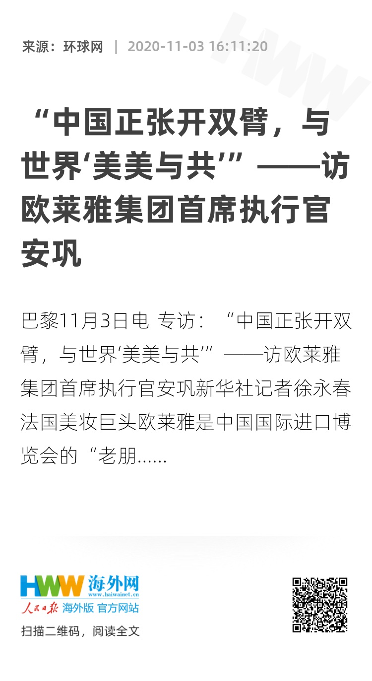 新华社巴黎11月3日电 专访:“中国正张开双臂,与世界‘美美与共’”——访欧莱雅集团首席执行官安巩