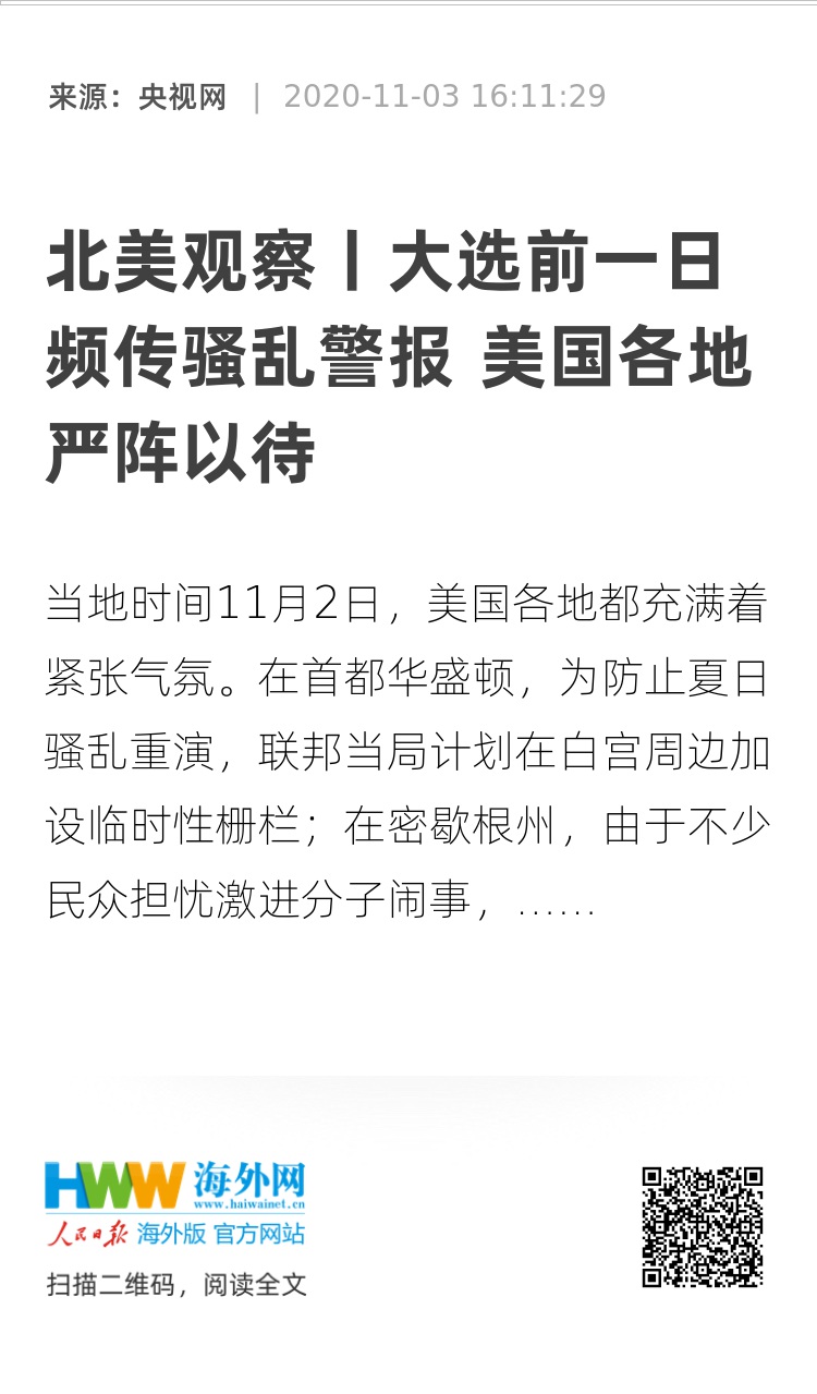 此外,由于安全形势不容乐观,近来保安突然成了一份吃香的工作。据美国全国广播公司(NBC)报道,随着全美各地众多商家正在为大选可能引发的社会动荡作准备,有些公司计划在选举日提前关门,并为部分门店雇用夜间保安。在10月最后两个星期,美国约有310家企业订购加固门窗的防护板,数十家企业要求在选举日增加保安人员。(央视记者 顾乡)
