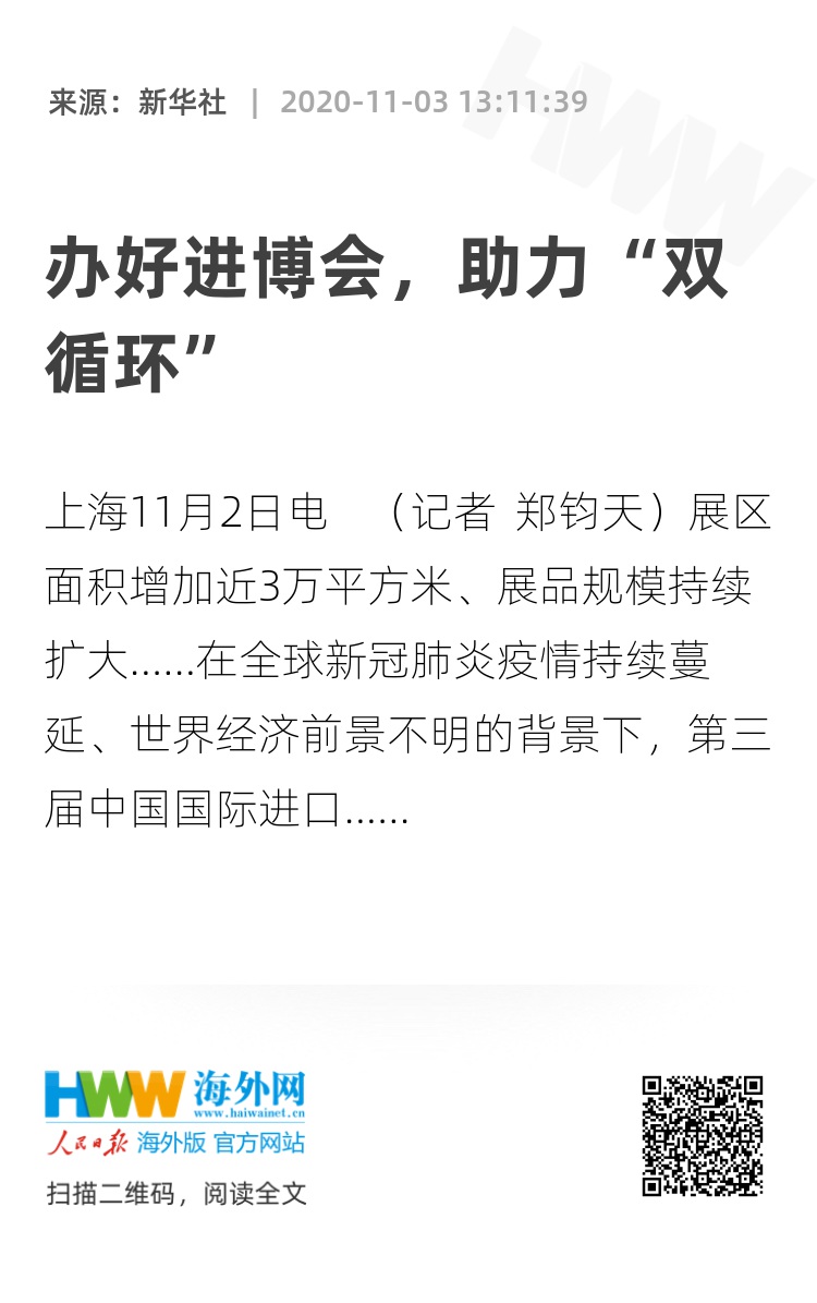 新华社上海11月2日电 (记者 郑钧天)展区面积增加近3万平方米、展品规模持续扩大……在全球新冠肺炎疫情持续蔓延、世界经济前景不明的背景下,第三届中国国际进口博览会如期举办意义非同一般。