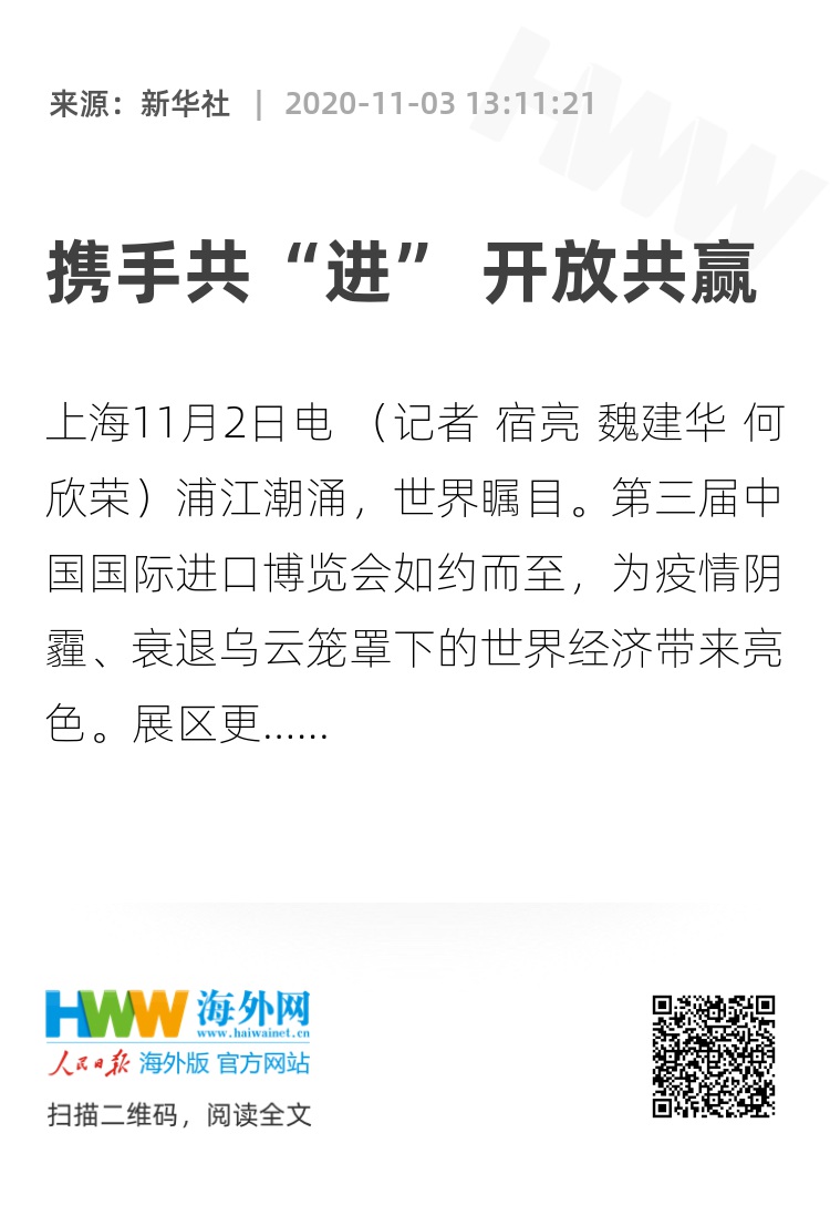 新华社上海11月2日电 (记者 宿亮 魏建华 何欣荣)浦江潮涌,世界瞩目。第三届中国国际进口博览会如约而至,为疫情阴霾、衰退乌云笼罩下的世界经济带来亮色。