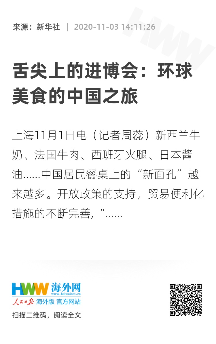 新华社上海11月1日电(记者周蕊)新西兰牛奶、法国牛肉、西班牙火腿、日本酱油……中国居民餐桌上的“新面孔”越来越多。开放政策的支持,贸易便利化措施的不断完善,“进博效应”持续呈现,“舌尖上”的变化,讲述着中国新开放故事。