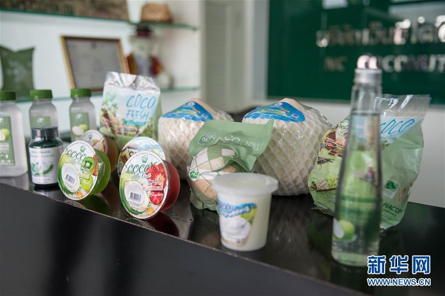 9月21日,在泰国叻武里府,纳隆萨创立的椰子公司柜台上陈列着其公司的椰子产品。 新华社记者 张可任 摄