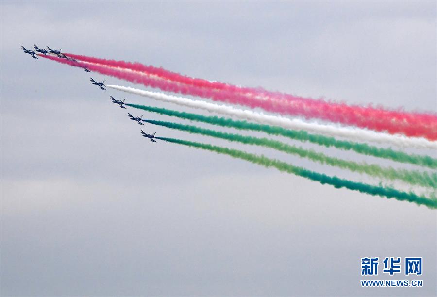 11月4日,意大利“三色旗”飞行表演队喷出象征国旗三色的烟雾飞过意大利首都罗马上空,庆祝国家团结日。 新华社发(阿尔贝托·林格里亚 摄)