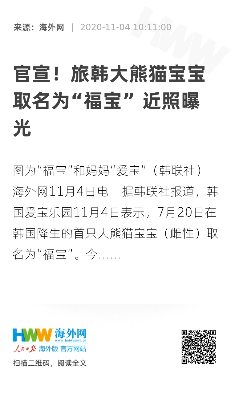 海外网11月4日电 据韩联社报道,韩国爱宝乐园11月4日表示,7月20日在韩国降生的首只大熊猫宝宝(雌性)取名为“福宝”。今年9月22日到10月11日,爱宝乐园为大熊猫宝宝公开征名,候选名字有4个,分别是超宝、星宝、幸幸和福宝。