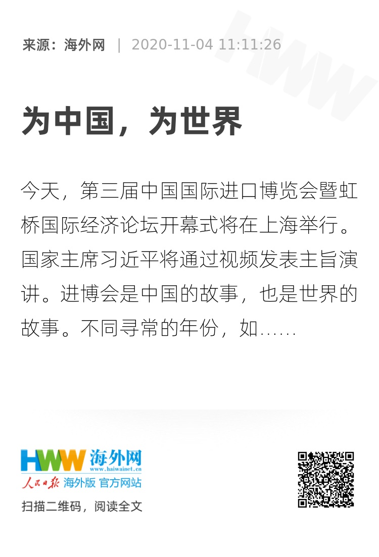 进博会是中国的故事,也是世界的故事。不同寻常的年份,如期举办的盛会,传递着中国坚定不移全面扩大开放的决心,同时为处于动荡变革期的世界增加了更多确定性。