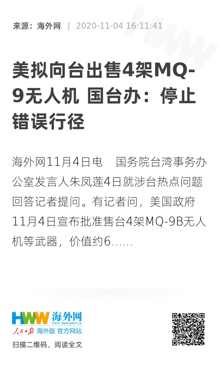 有记者问,美国政府11月4日宣布批准售台4架MQ-9B无人机等武器,价值约6亿美元。对此有何评论?