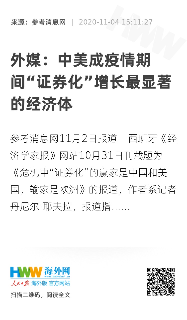 参考消息网11月2日报道 西班牙《经济学家报》网站10月31日刊载题为《危机中“证券化”的赢家是中国和美国,输家是欧洲》的报道,作者系记者丹尼尔·耶夫拉,报道指出,瑞典、中国和美国是在新冠肺炎疫情期间证券化增长最多的经济体。全文摘编如下: